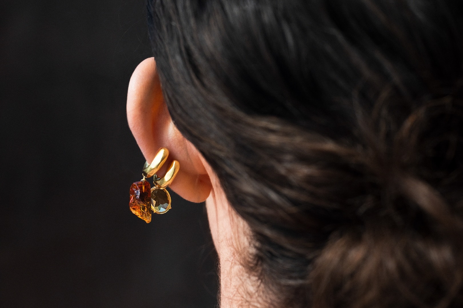 イヤーカフは古代を感じさせる有機的なニュアンスのボリュームある地金を使用しています。ありそうであまりなかったカラーストーンのイヤーカフ。トレンド感も出て、光も透過しやすい耳元に色石を着けるのは、カラーストーン初心者の方でもとても取り入れやすく、おすすめのアイテムです。