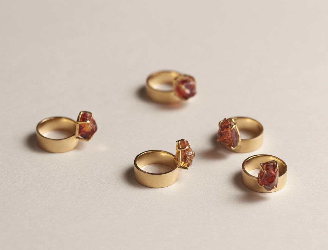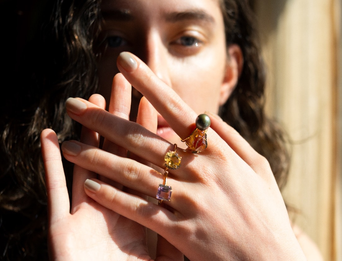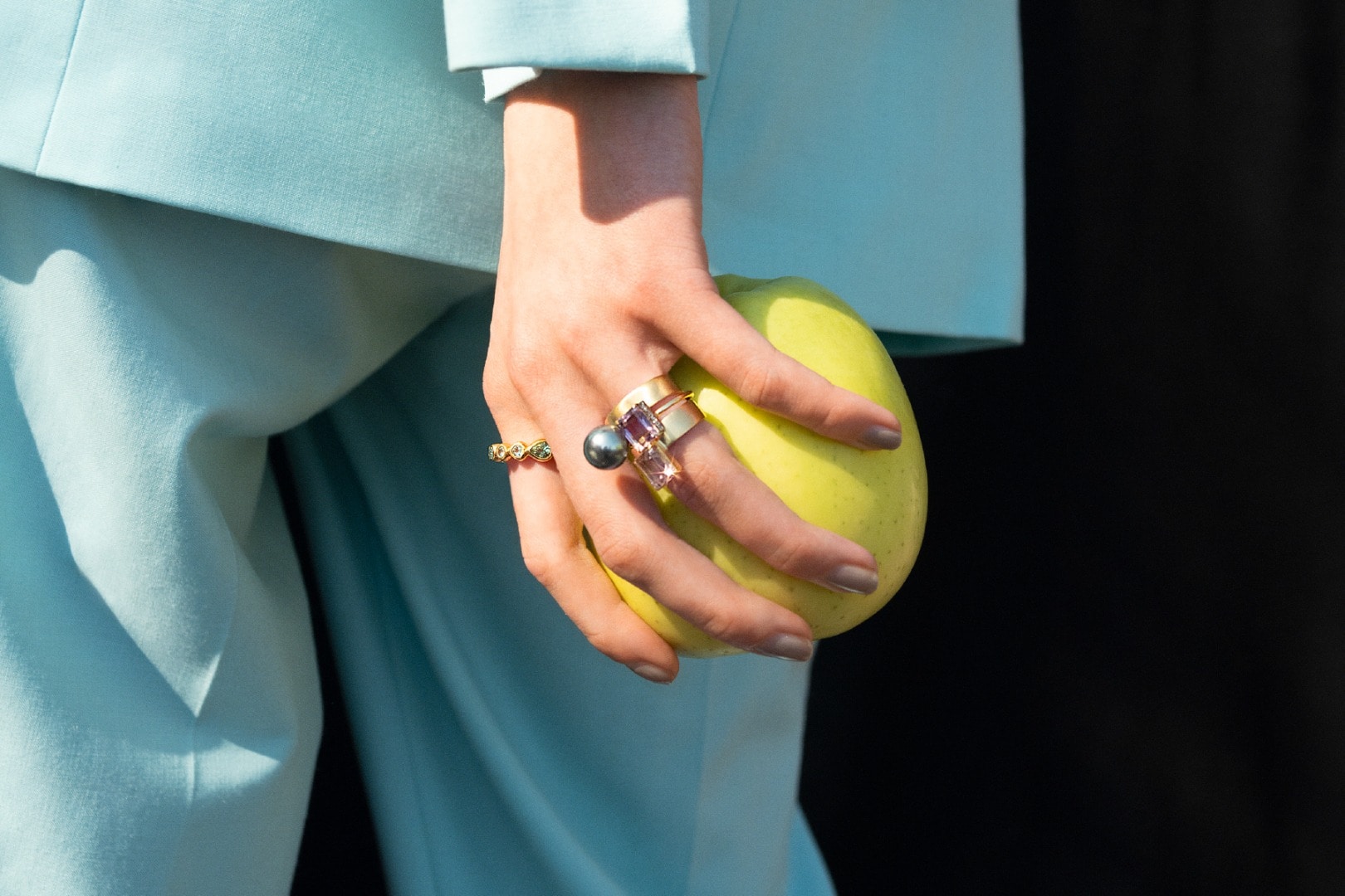 今回は同時発売の同じシリーズでも、オーバル、レクタングル、ラフカット、球体と、石によって、それぞれ形が異なるのも大きな魅力。様々な組み合わせでスタッキングを楽しんでいただけます。