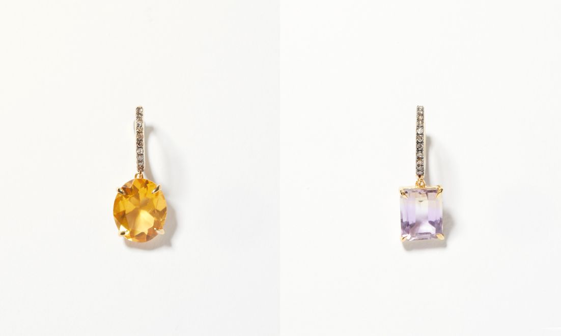 [elafonisi] oval citrine pave diamond single pierced earring 24,200yen (with tax) / [elafonisi] rectangle ametrine pave diamond single pierced earring 22,000yen (with tax)