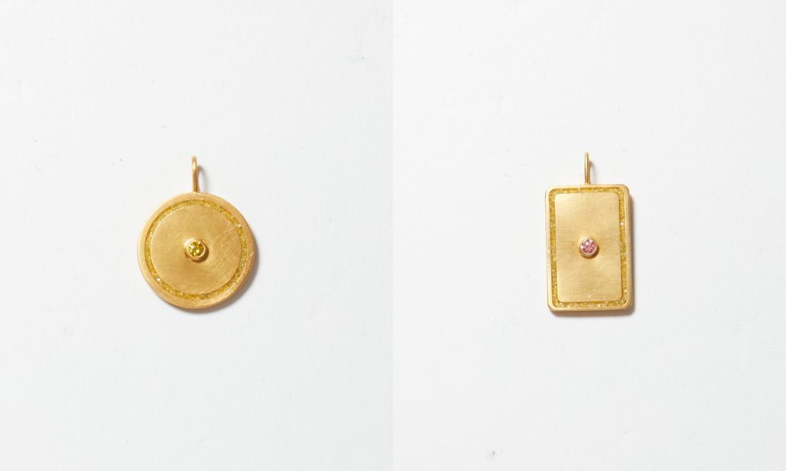 最後にご紹介するのは、イエローとピンクのラボグロウンダイヤモンドを、シンプルに一粒添えたデザイン。こちらのチャームも、ラボグロウンダイヤモンドを研磨した際に出た粉を敷き詰め、縁取りました。