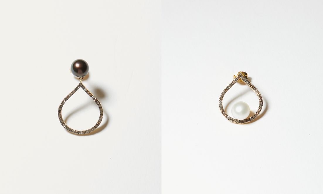 左はグレーパールにダイヤモンドで象ったロータスの花びら“ペタルモチーフ”を垂らした、センシュアルに揺れる煌びやかなシングルピアス。右はそのペタルモチーフに、無垢な輝きを放つ白いパールを添えて、スタッドピアスに仕上げました。