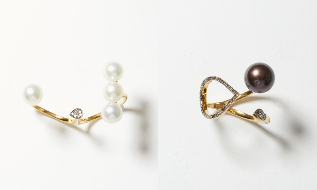 左は美しい伊勢志摩産のアコヤのバロックパールを4粒配した、モダンなフォルムのダブルフィンガーリング。指の間に浮かび上がるように、パヴェダイヤでロータスのつぼみを象りました。右は、異なる3つのモチーフのバランスが絶妙に美しく、空想的に煌めくオープンリング。妖艶な輝きを放つグレーのタヒチパールが、オリエンタルな手元に。