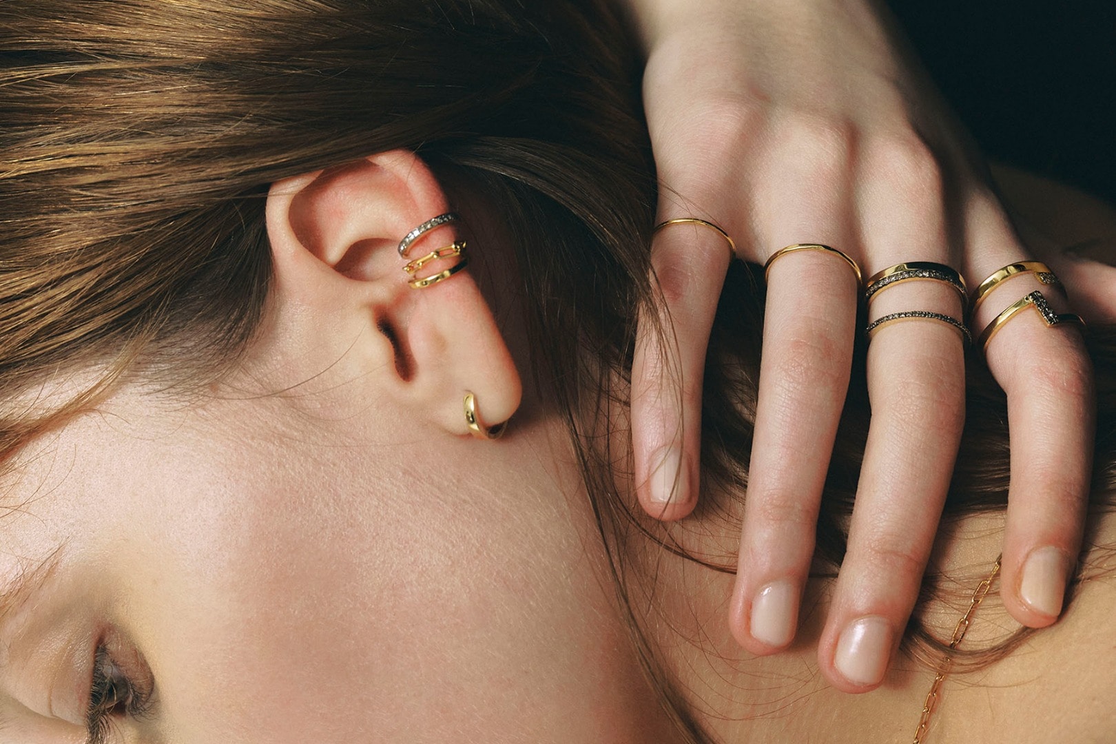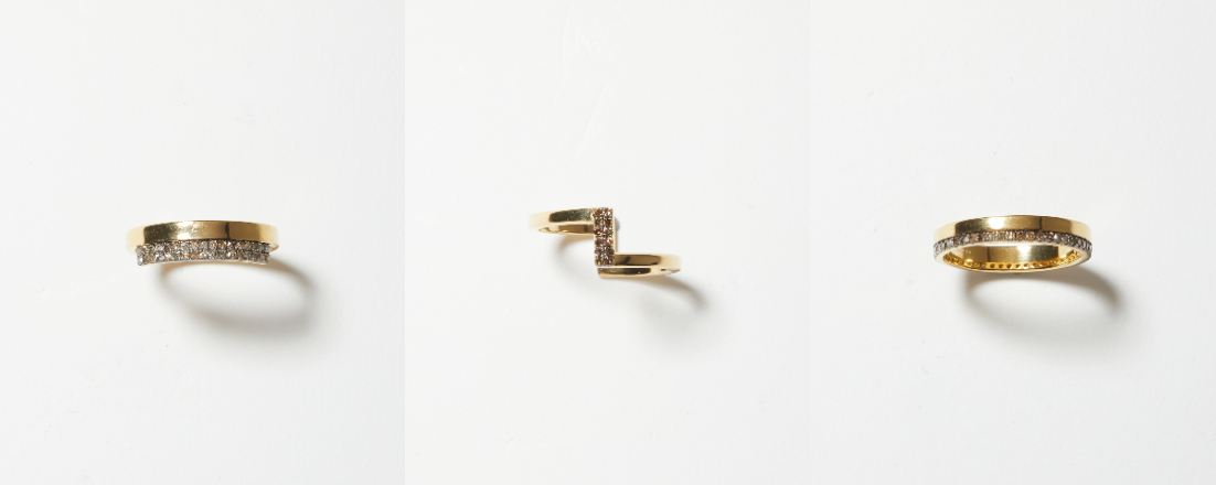 シックに煌めくダイヤモンドで象った、ユニークなフォルムのリングを3種類ご用意しました。直線的なパターンのデザインになっているので、モデルのように全てスタッキングするのもおすすめです。