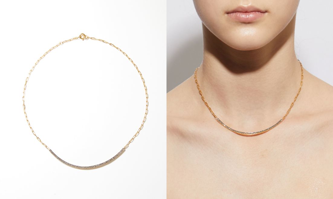 続いてご紹介するのは、シックに煌めくダイヤモンドのパヴェが美しい弧を描くチョーカー。チェーンから緩やかにカーブするバーが、デコルテラインを綺麗にみせてくれます。