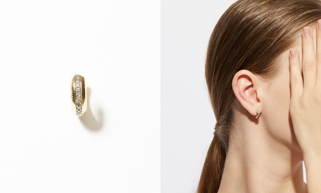 ぽってりとしたフォルムに整列したパヴェダイヤモンドが静かに煌めくミニマムサイズのフープピアス。シングル販売なので、左右でアシンメトリーなスタイリングや、イヤーカフとの重ねづけもお楽しみください。
