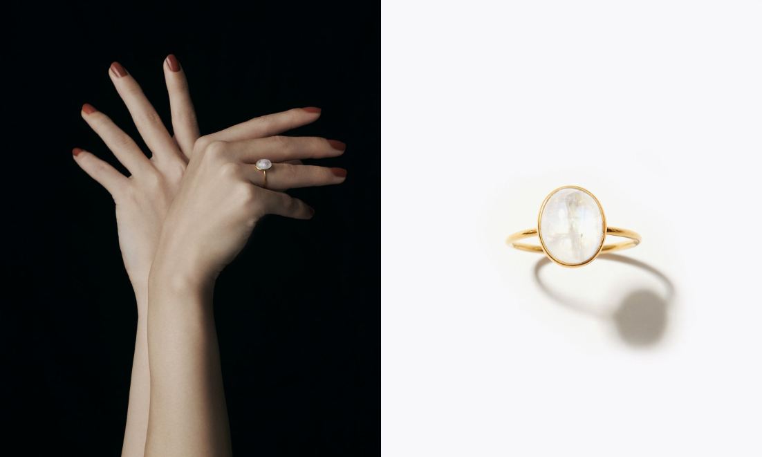 飴玉のようなカボションカットの神秘的なレインボームーンストーンをシンプルにK10YGの地金で取り巻いたリング。瑞々しい果実のようなカラーのネイルカラーに透明感を添えて。