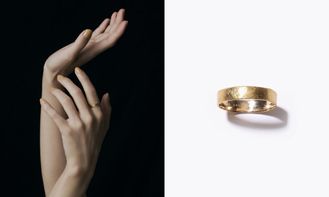 “sand”カラーには、漆喰のようなマットな表情がミニマルながらも印象的なワイドバンドリングを。素肌に溶け込む優しい奥行きのあるベージュカラーが、ゴールドの輝きを一層引き立てます。