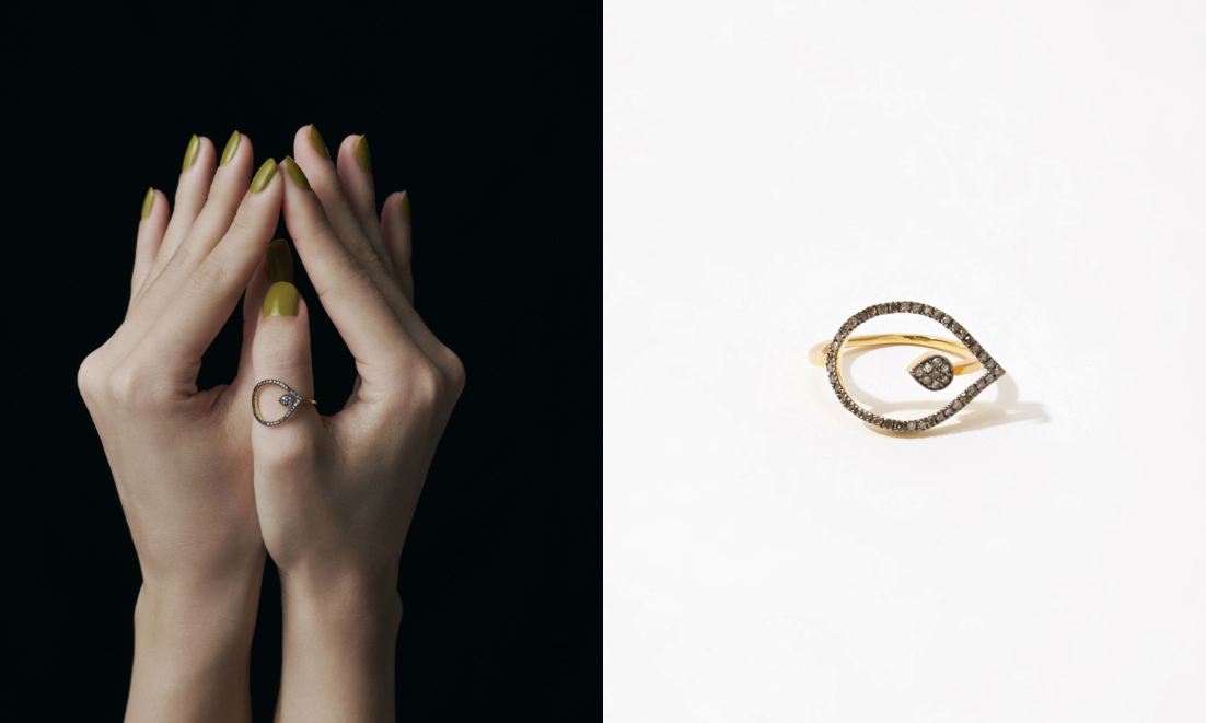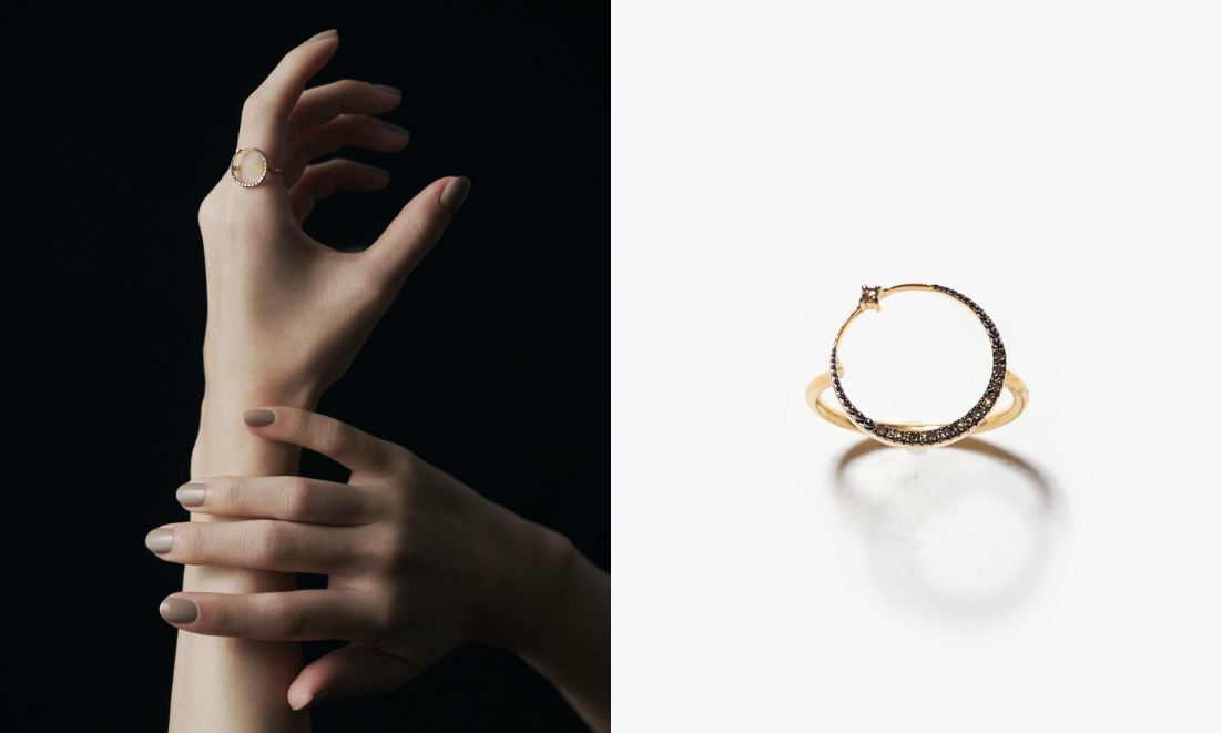 夜空に煌めく新月モチーフを、パヴェダイヤモンドで象ったリング。ブラウンダイヤモンドとブラックロジウムコーティングがシックな華やぎを添えます。モチーフの先には一番星を象徴するブラウンダイヤモンドを一粒。繊細なサークルモチーフとニュートラルカラーで、華奢な指先を演出。