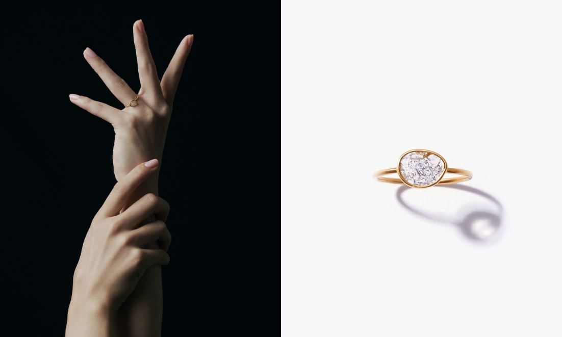 素材の個性をそのまま残した形状と、表情が魅力のスライスダイヤモンドのリング。ひとつひとつインクルージョンの模様が豊かな石をシンプルにK18ゴールドで巻いてリングに仕上げました。オーガニックな石本来の輝きで、爪本来の美しさを引き出します。
