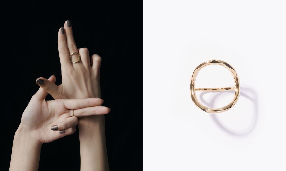 手の上にサークルが浮いているように見える、モダンなフォルムのリング。表面にテクスチャーをつけることで、古代の風合いを感じさせつつもモダンなルックに仕上がります。