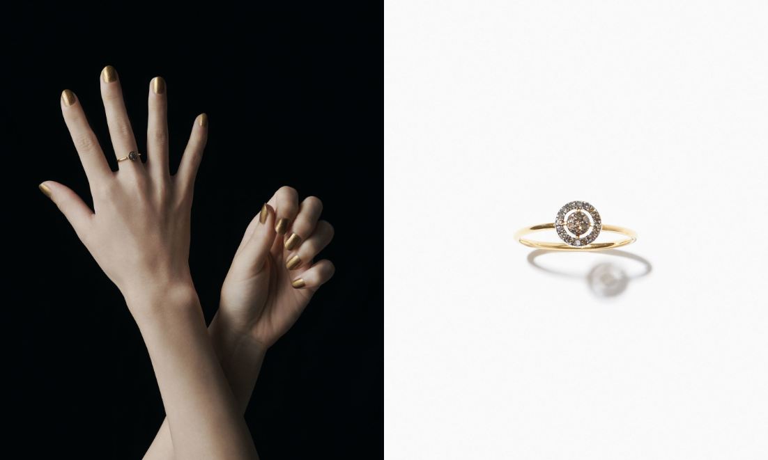 宇宙に浮かぶ惑星のごとく、神秘的なラインを描くサークル。小振りながら存在感のあるパワーを感じさせるリング。贅沢に埋め込まれたブラウン系のメレダイヤモンドと繊細なゴールドラメの煌めきは、まるで夜空に浮かぶ星々のよう。