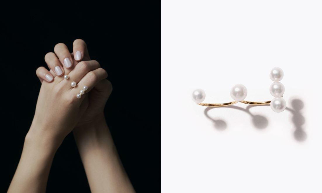美しいアコヤのバロックパールを5粒配した、モダンなフォルムのダブルフィンガーリング。ピュアなパールの艶めきが浮き立つような指先に。