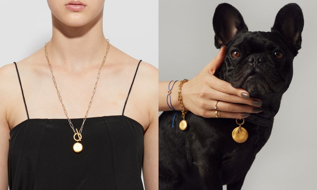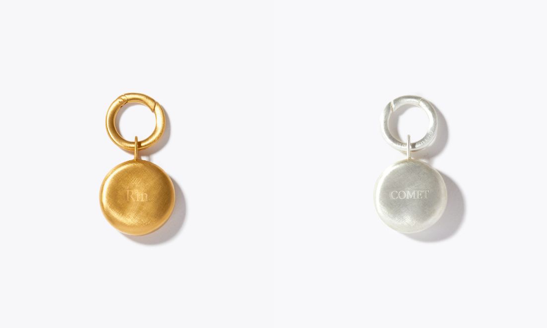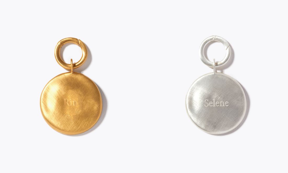 チャームは、開閉が可能なオリジナルのカラビナ付きなので、カラー(首輪)の金具に付けることができます。ご自身でも身につけて楽しんでいただけるように、上品なダルポリッシュ(シャインとマットの間のような風合い)に仕上げました。カラーはゴールドとシルバーの展開。サイズはLarge/Mediumでご用意しております。