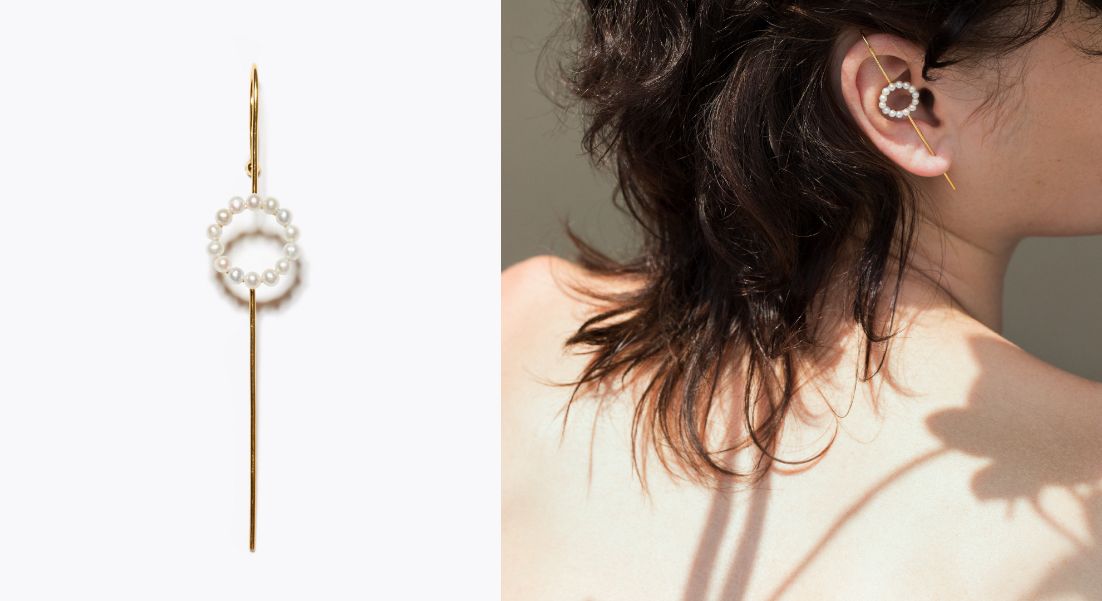 シャープな印象のイヤーカフピアスには、可憐なベビーパールをサークルモチーフにひとつずつ留めました。モダニティ溢れる耳元に。