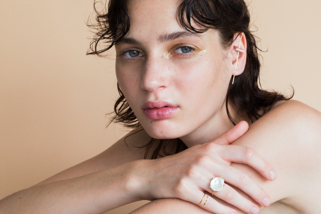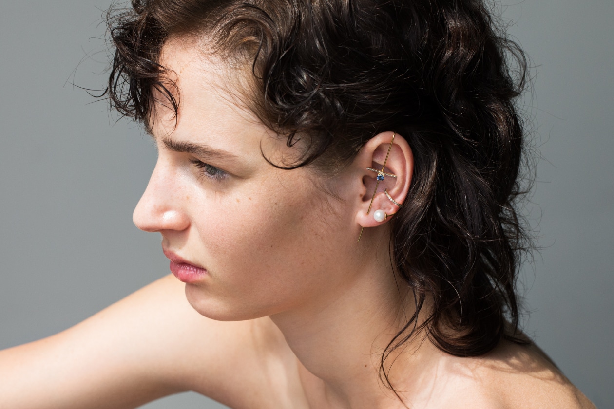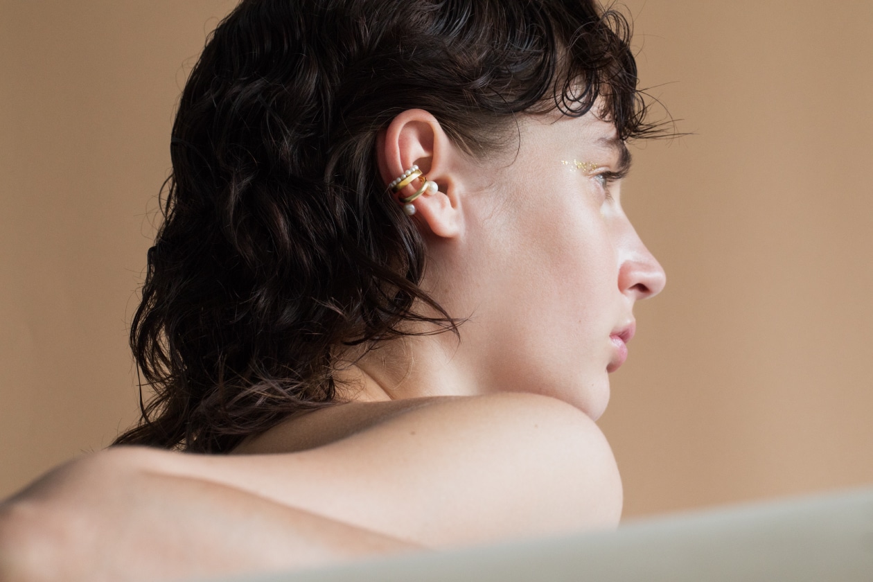 繊細なベビーパールをあしらった、後ろ姿までも美しく飾るイヤーカフも登場。モデルのようにベビーパールのイヤーカフを重ね付けいただくのもおすすめです。