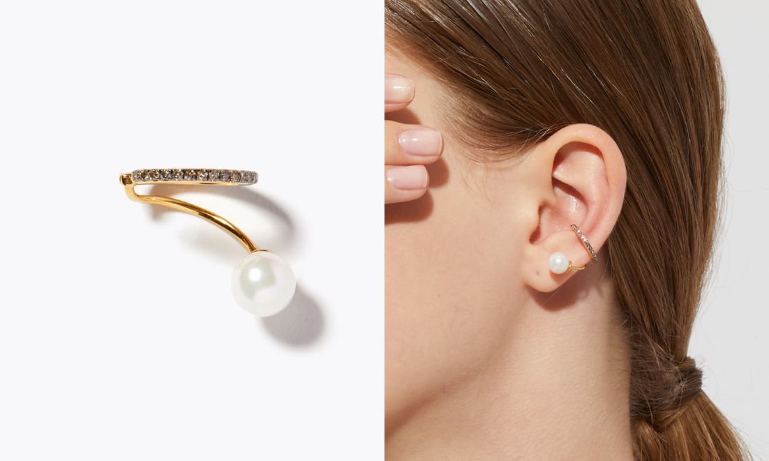 シックなブラウンダイヤモンドのラインと、無垢な艶めきを放つパールのバランスが美しいイヤーカフは、まるでピアスと重ねづけをしているかのようなデザイン。モデルのようにイヤーカフピアスとのレイヤードも煌びやかで素敵です。