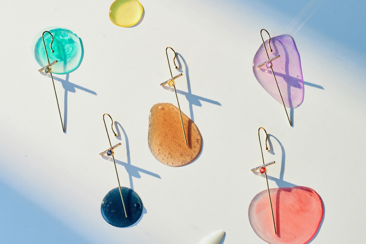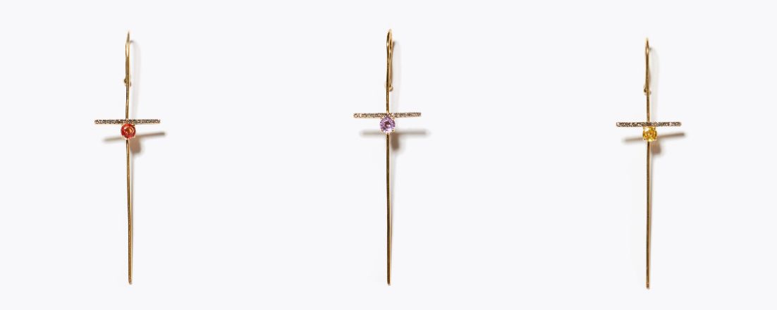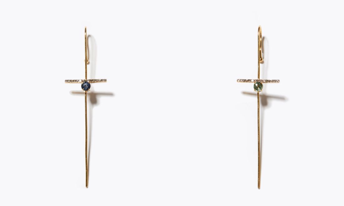 耳の上部に引っ掛け、ピアスホールに通す、シャープなラインのイヤーカフピアス。ブラウン系のパヴェダイヤモンドバーに、鮮やかな発色のカラーサファイアを添えた、モダンなデザインをご用意しました。
