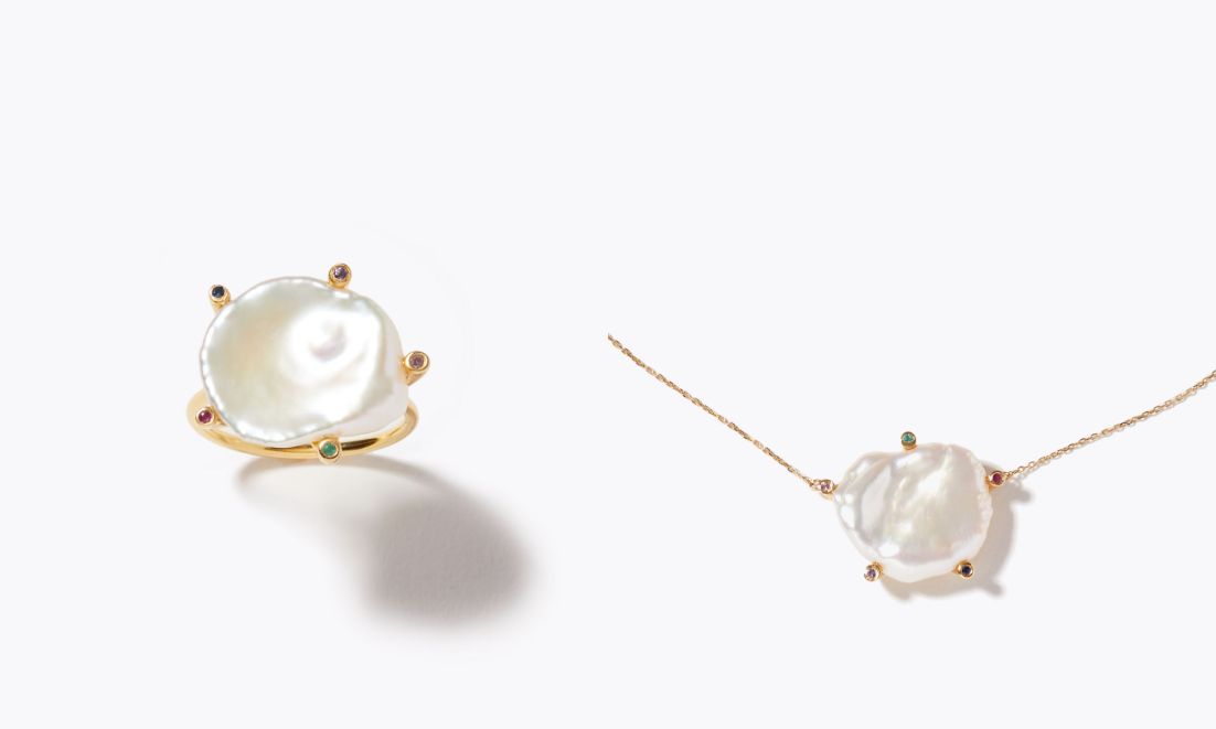 [philia] keshi pearl multi-stone prong ring 19,800yen (with tax)/[philia] keshi pearl multi-stone prong necklace 39,600yen (with tax)