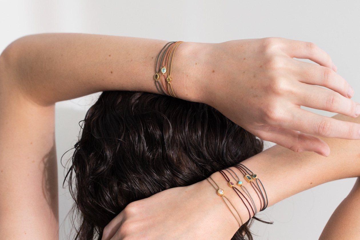 右は黄土色系のコードに、熟したレモンのように煌めくイエローサファイアを添えたブレスレット。