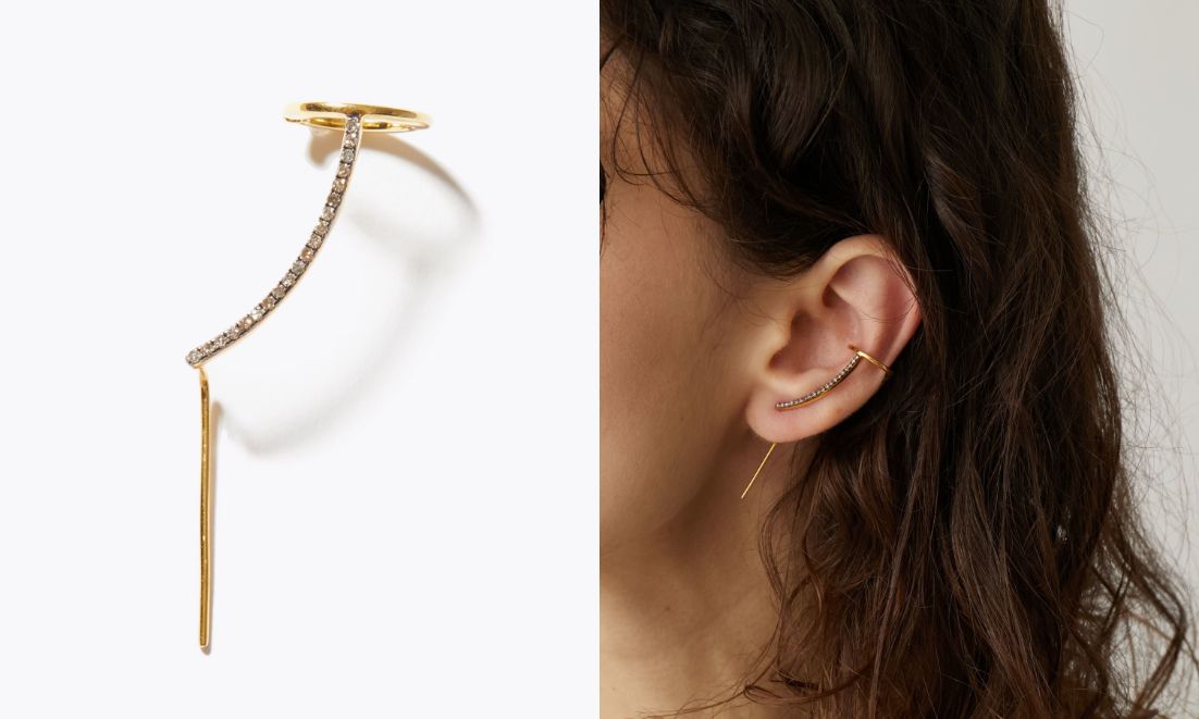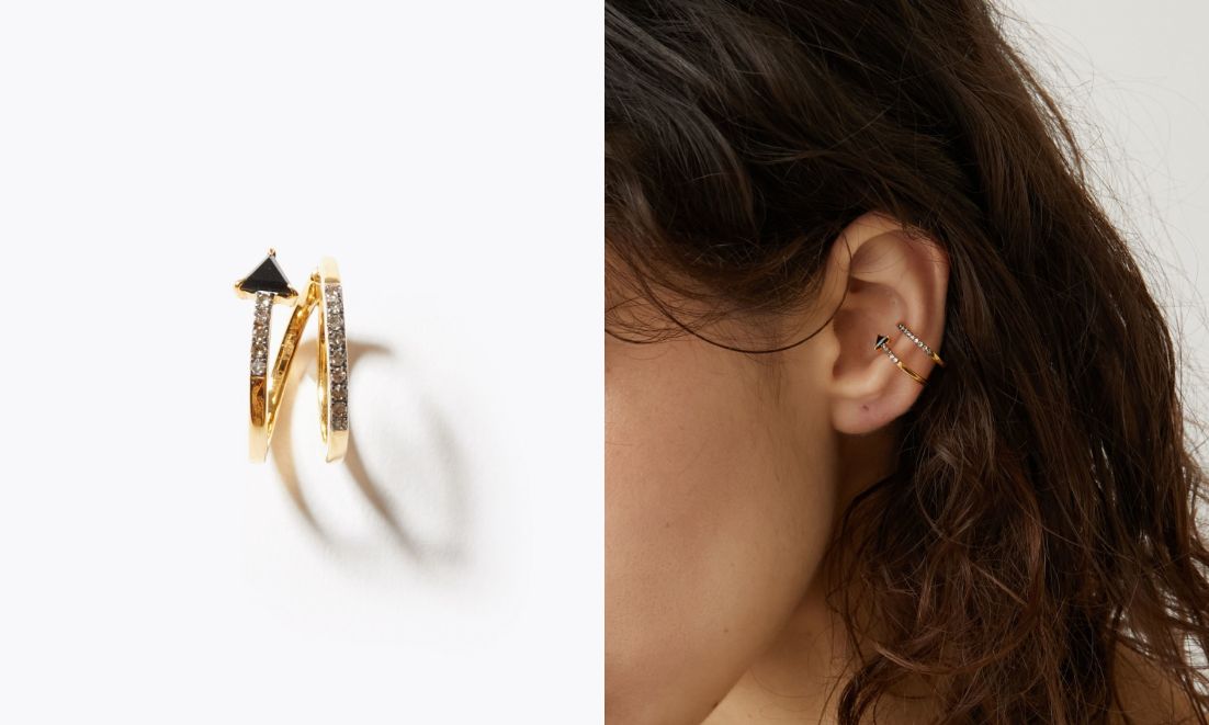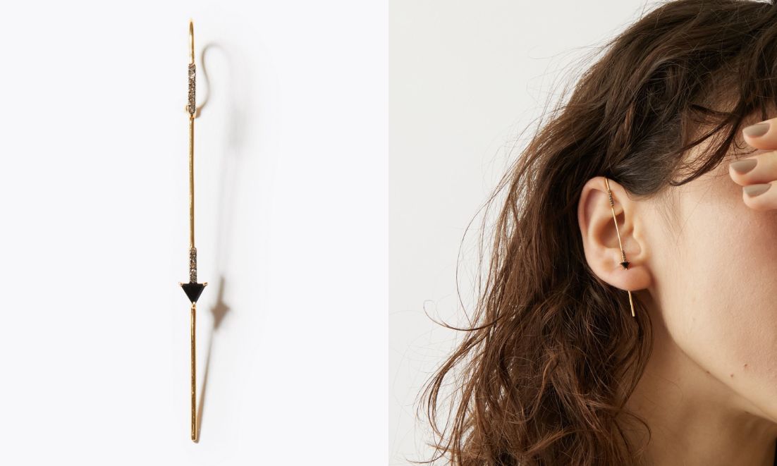 こちらは、耳の上部に引っ掛け、ピアスホールに通すイヤーカフピアスと、耳に回り込むようにデザインしたイヤーカフ。ひとつでも存在感溢れるイヤーアイテムです。