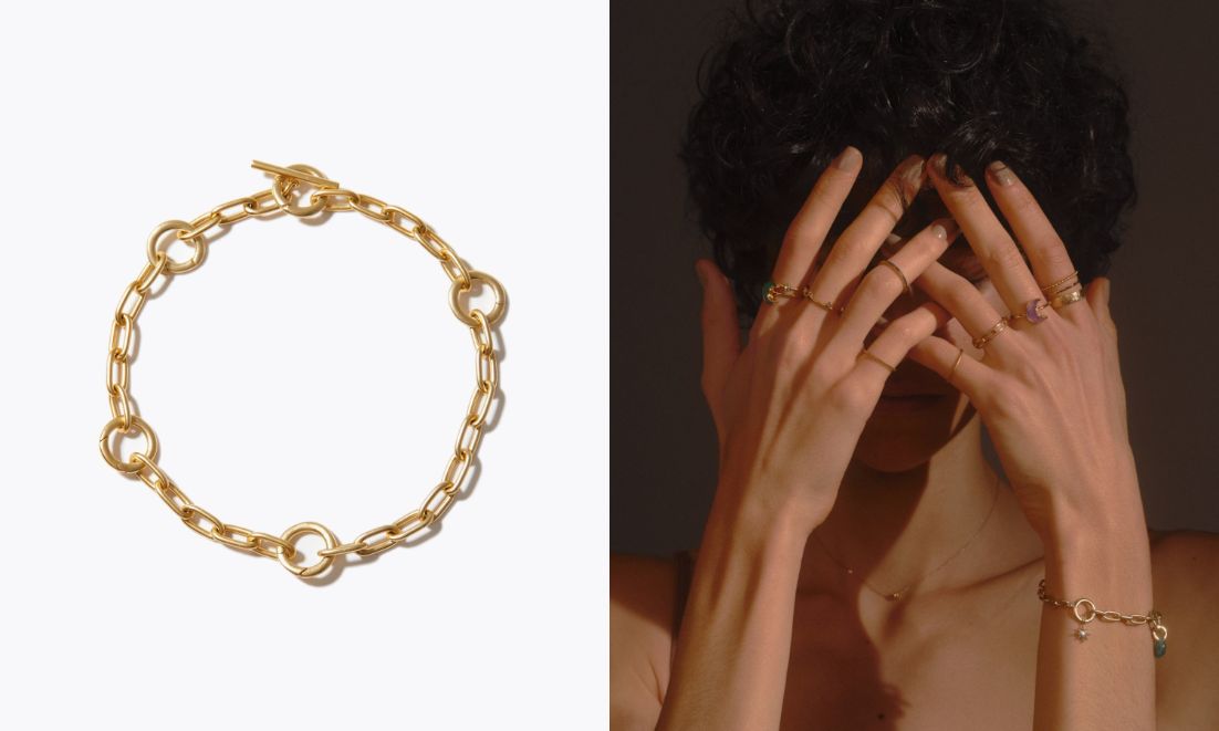 5つのトグルがついたブレスレットもご用意しました。モデルのようにチャームをつけたり、お手持ちのバングルと合わせたりと自由なスタイリングでお楽しみいただけます。