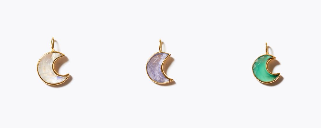 [selene] rainbow moonstone moon charm 13,200yen (with tax)/[selene] tanzanite moon charm 19,800yen (with tax)/[selene] green onyx moon charm 13,200yen (with tax)