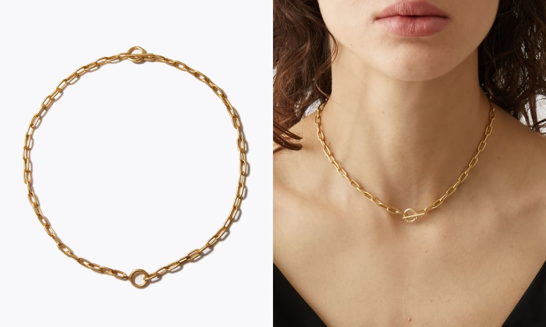 2つのトグルを添えたネックレスは、バックスタイルのアレンジを楽しんでいただくのもおすすめです。こちらもチョーカーと同じように、ブレスレットとしてもお使いいただけます。