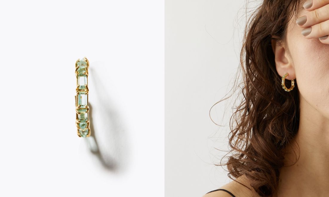 フープピアスはシングル販売なので、左右ペアでつけたり、エメラルドのスタッドピアスとアシンメトリーに組み合わせたりと、様々なスタイリングをお楽しみいただけます。