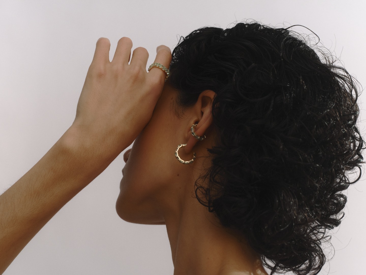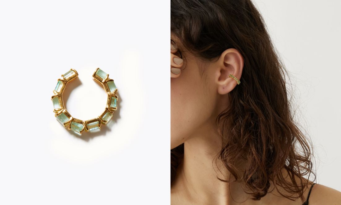イヤーカフはエメラルドをぐるりと並べ、耳にまわり込むようにデザインし、どの角度から見ても美しいシルエットに仕上げました。モデルのように、同じエメラルドのフープピアスと合わせてつけるのもおすすめです。