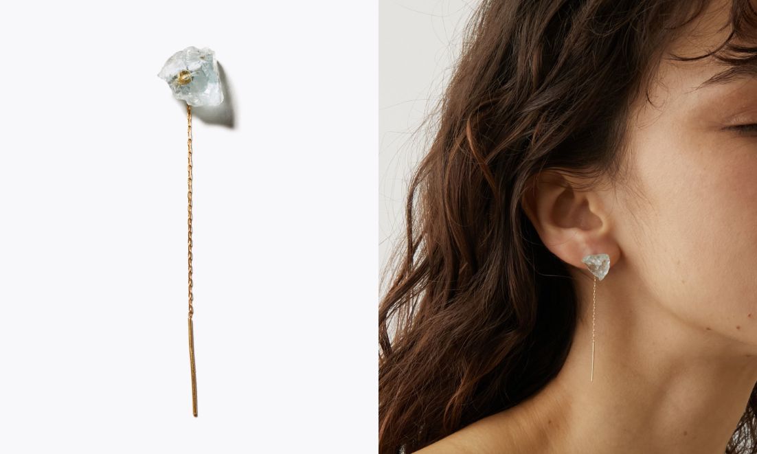 ピアスは、大粒の原石をシンプルに留めてデザインしました。ピアスは大粒の原石にチェーンを配してデザインしました。キャッチの位置を調整すれば、スタッズのようにも、チェーンが揺れるピアスのようにもアレンジしてお使いいただけます。イヤリングは、コロンとしたキラキラと輝く個性豊かな大粒の原石をシンプルに留めました。どちらもシングル販売なので、片耳でつけたり、別のデザインと組み合わせていただいたりと自由にスタイリングを楽しんでいただけますと幸いです。