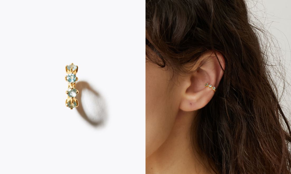 バネが内蔵されているので、耳たぶにつけるとピアスのような雰囲気でお使いいただけます。つける位置を変えると、イヤーカフのようにもお楽しみいただけます。
