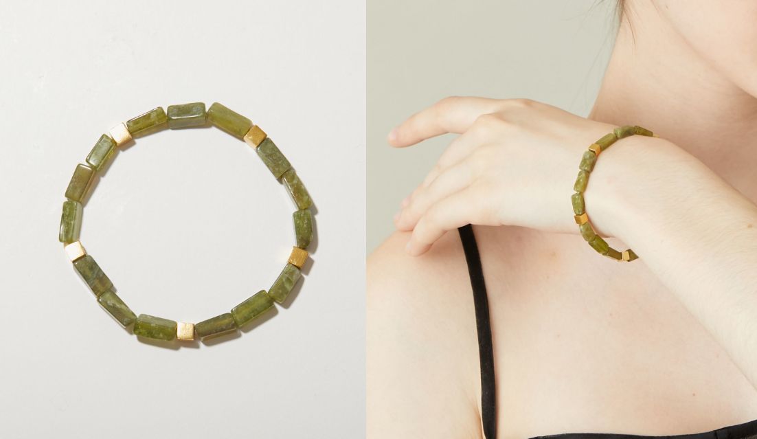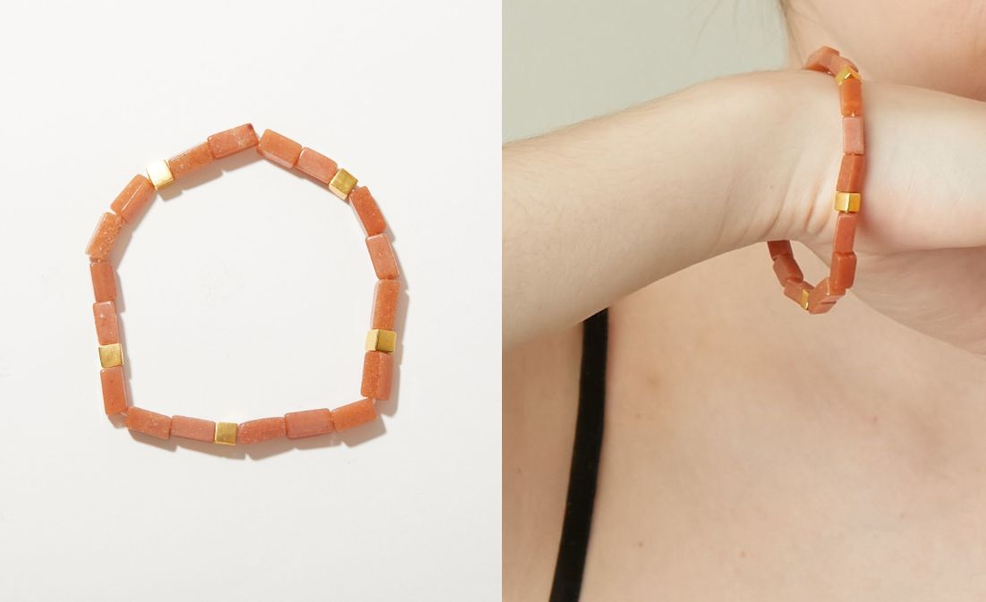 石同士のパワーは喧嘩することはありませんので、気になるものをいくつもレイヤードしていただくのもおすすめです。すっきりとしたキューブビーズのブレスレットはバングルや他のブレスレットとも相性が良いので、様々な手元のコーディネートをお楽しみいただけましたら幸いです。