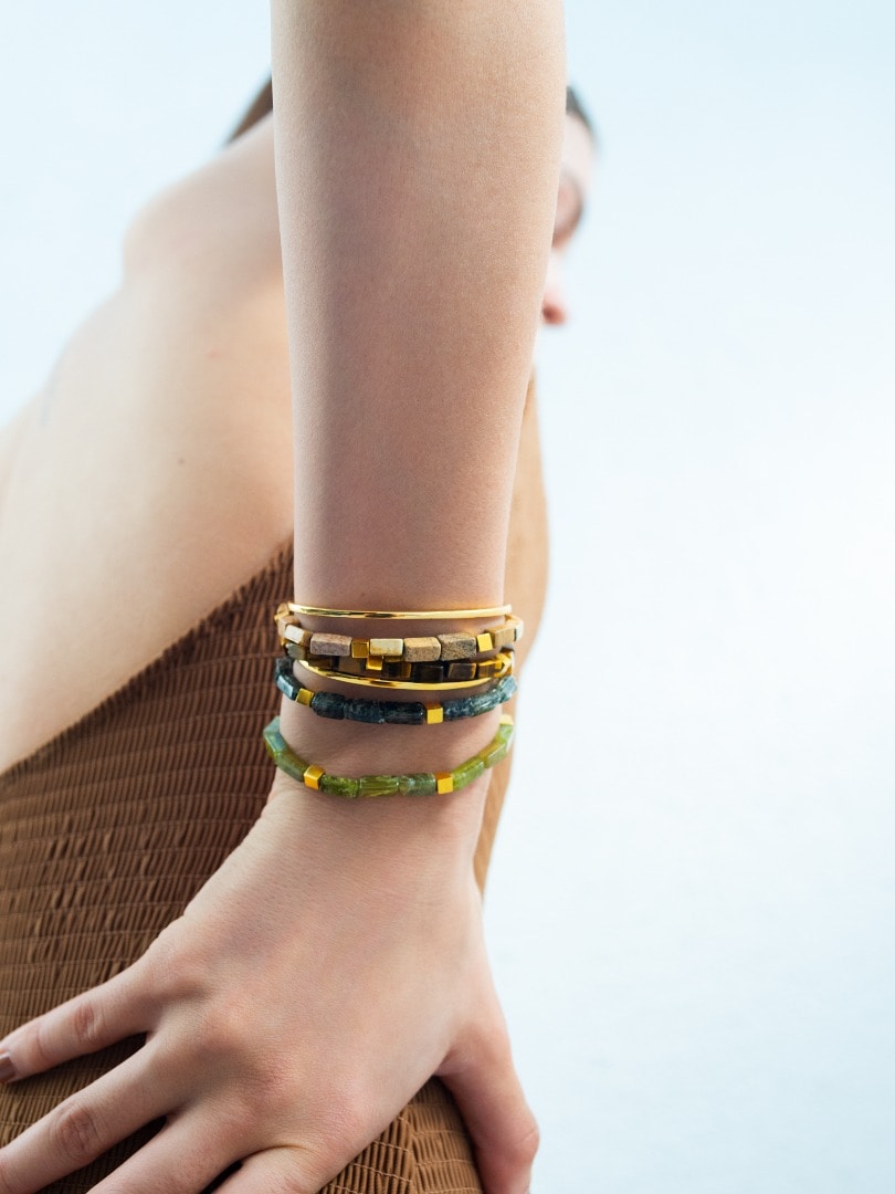 ご好評いただいている“amulette”の新作ブレスレットは、個性豊かなキューブの石を連ねたデザインが登場しました。ゴールドピーズを間に挟み、夏らしい風合いに仕上げました。