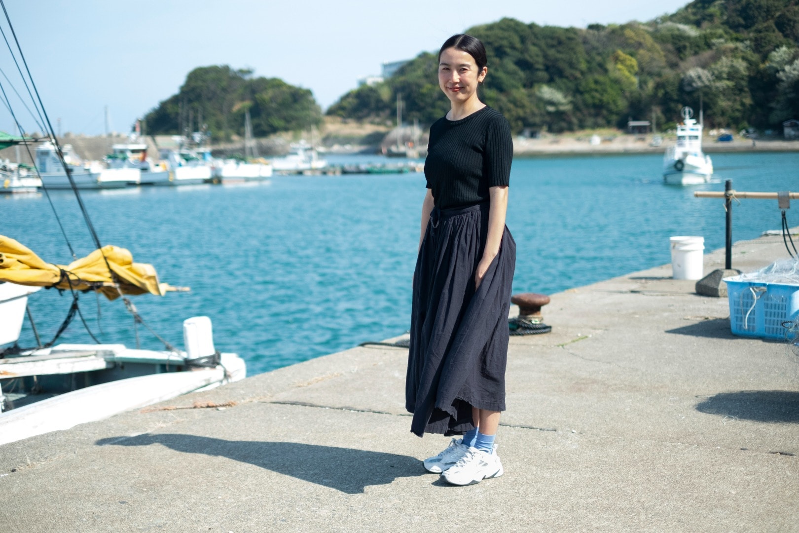 デザイナー・ジュエリーアーティストの本多沙映。伊勢志摩の石鏡漁港にて。
