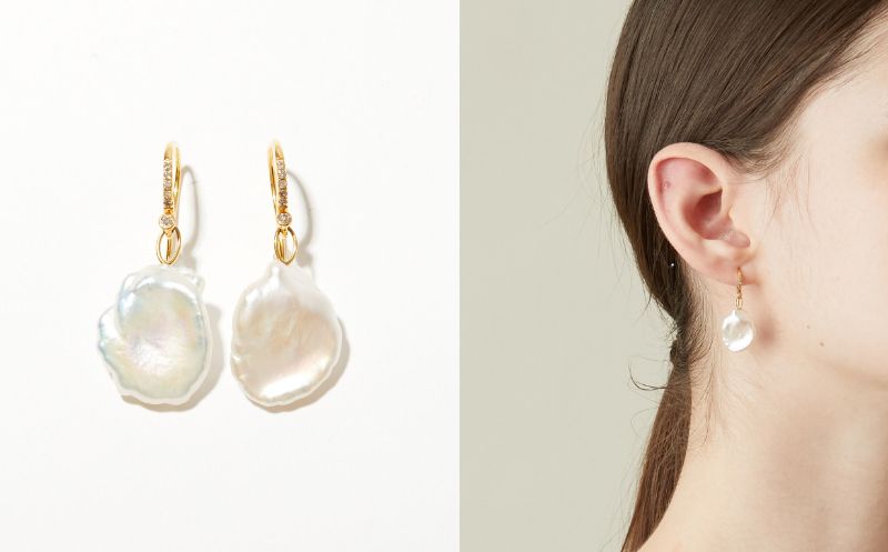 花弁のようなペタルパールが耳元で可憐に揺らめくピアス。フックにはダイヤモンドのパヴェをあしらいました。