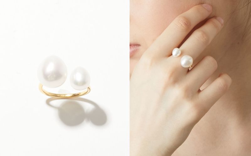 大ぶりのバロックパールを、大きさ違いのバランスで配したオープンリング。ひとつでも存在感がありますが、“basic”シリーズのリングとのスタッキングもおすすめです。