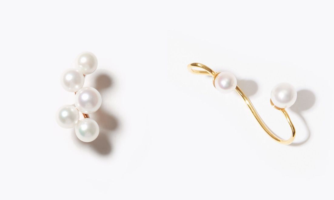 先にご紹介させていただいたピアスと同じデザインのクリップ型のイヤーカフと、アコヤのバロックパールを二粒配した、モダンなフォルムのイヤーカフ。こちらは耳の上部に着けてお楽しみいただけます。