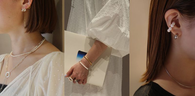 こちらのページの左下に今表示されている「Staff Styling」のポップアップ画像から、パールジュエリーのおすすめスタイリングを提案しています。パールジュエリーをお探しの方はもちろん、ジュエリーのスタイリングにお迷いの方も是非ご覧くださいませ。