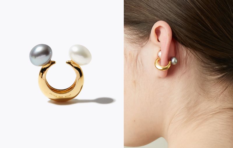 こちらは、ぽってりとした2色のパールを前後に配したイヤーカフ。リバーシブルの仕様なので、気分に合わせてスタイリングしていただけます。後ろ姿まで美しく見せてくれます。