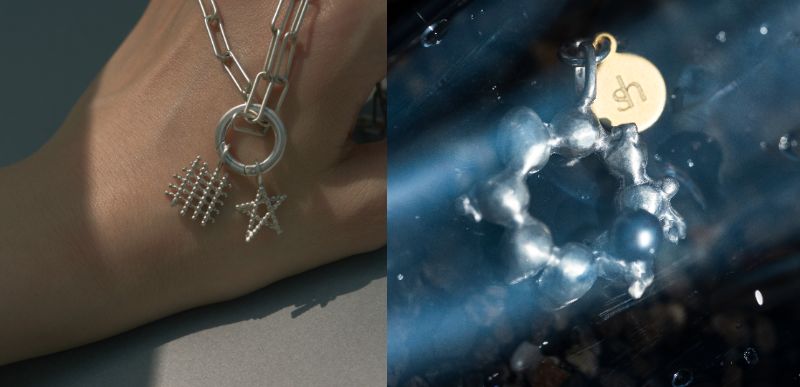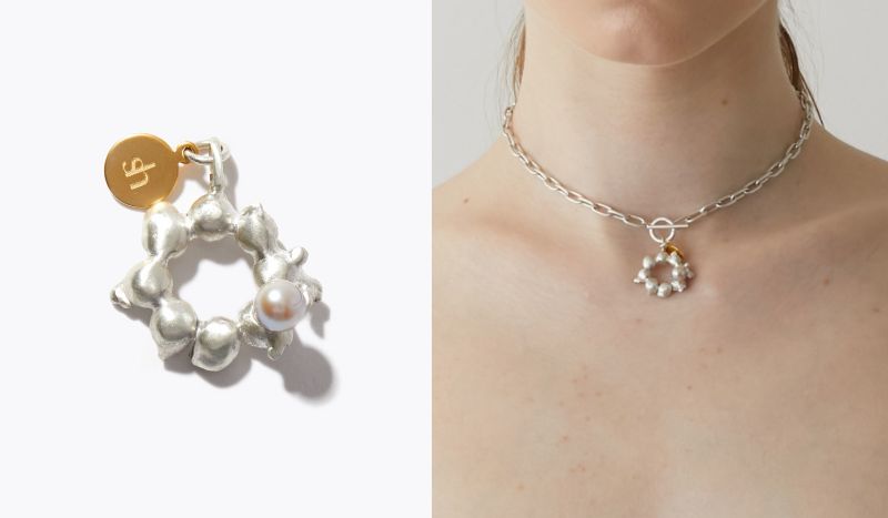 こちらは商品としてははじかれてしまう、不良真珠と呼ばれる個性豊かなアコヤパールをあえて原型にして型をとり、真円のグレーのアコヤパールを一粒添えたチャーム。ひとつずつ形の違う不良真珠の躍動感と、真円の静謐な表面。「不良真珠と真円の真珠に優劣をつけるのではなく、すべてはフラットな生命であることを表現したい」という想いが込められています。