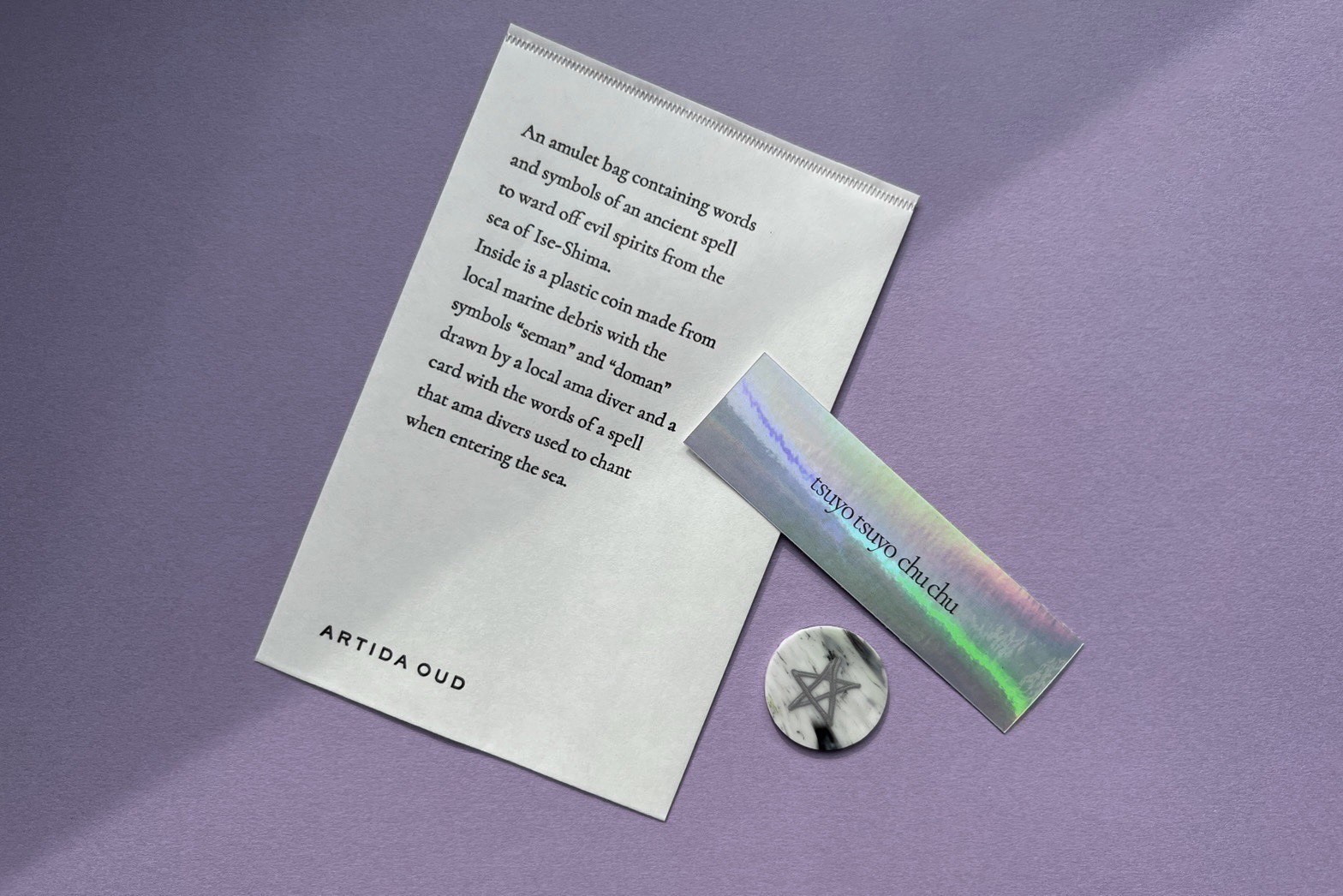 伊勢志摩にて、全国の漁業者と手を組み海洋プラスチックの回収から再資源化を一貫して行っている「Remare」のプラスチックコインと、伊勢志摩の海女さんの魔除けのおまじないを記したステッカーの入ったAmulet Bag。お守りとして身につけていただけたらと願い、伊勢志摩のパワーを込めました。ぜひご自由にお持ち帰りください。