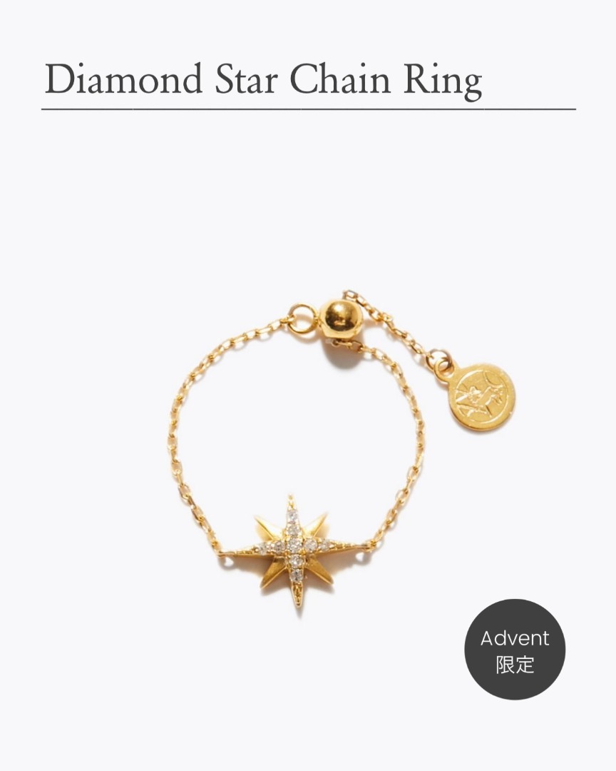 アドベントカレンダーの為に特別にデザインした、チェーンリング。夜空に煌めく八芒星を象ったモチーフに、パヴェのホワイトダイヤモンドが煌めきます。