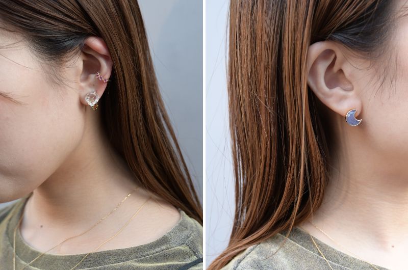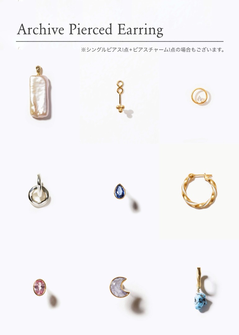 ※アーカイブピアスの例。ピアスは、シングル(片耳)とペア(両耳)の商品が混在しております。また一部、2点のうち1点は、ピアスチャームのものもございます。