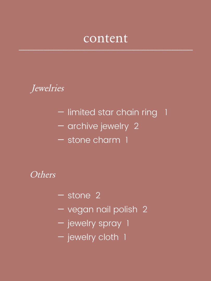 アーカイブジュエリー2点(約3万6千円以上)、サイズフリーのチェーンリング、ネイルポリッシュ2色、ケアグッズ、お守りの原石、アソートのストーンチャーム1点の合計10点を詰め込んだ特別なボックスです。アーカイブジュエリーは、リング・ピアス・イヤリングのセットをそれぞれご用意しておりますので、ご希望に合わせてお選びください。