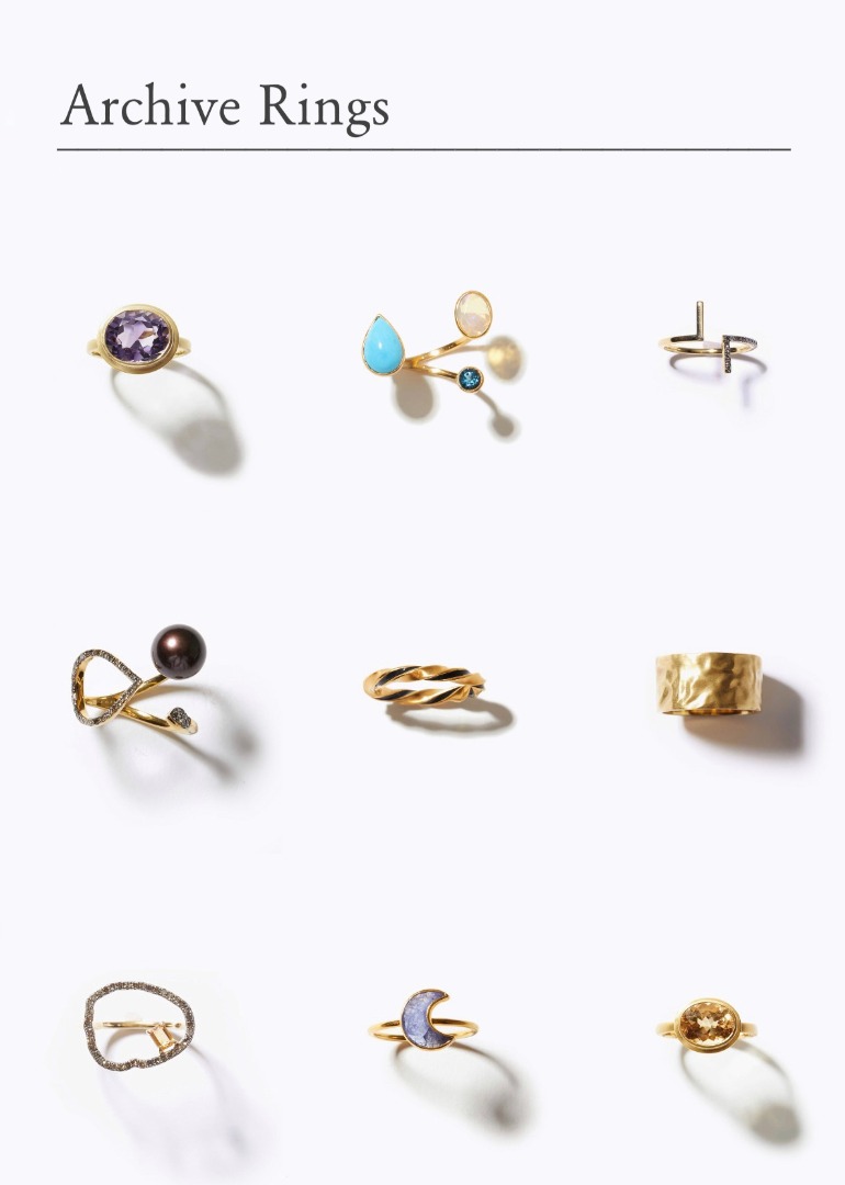 リング(7号~13号)、ピアス、イヤリングのセットをそれぞれご用意しており、アーカイブジュエリーは、必ず2点入っております。