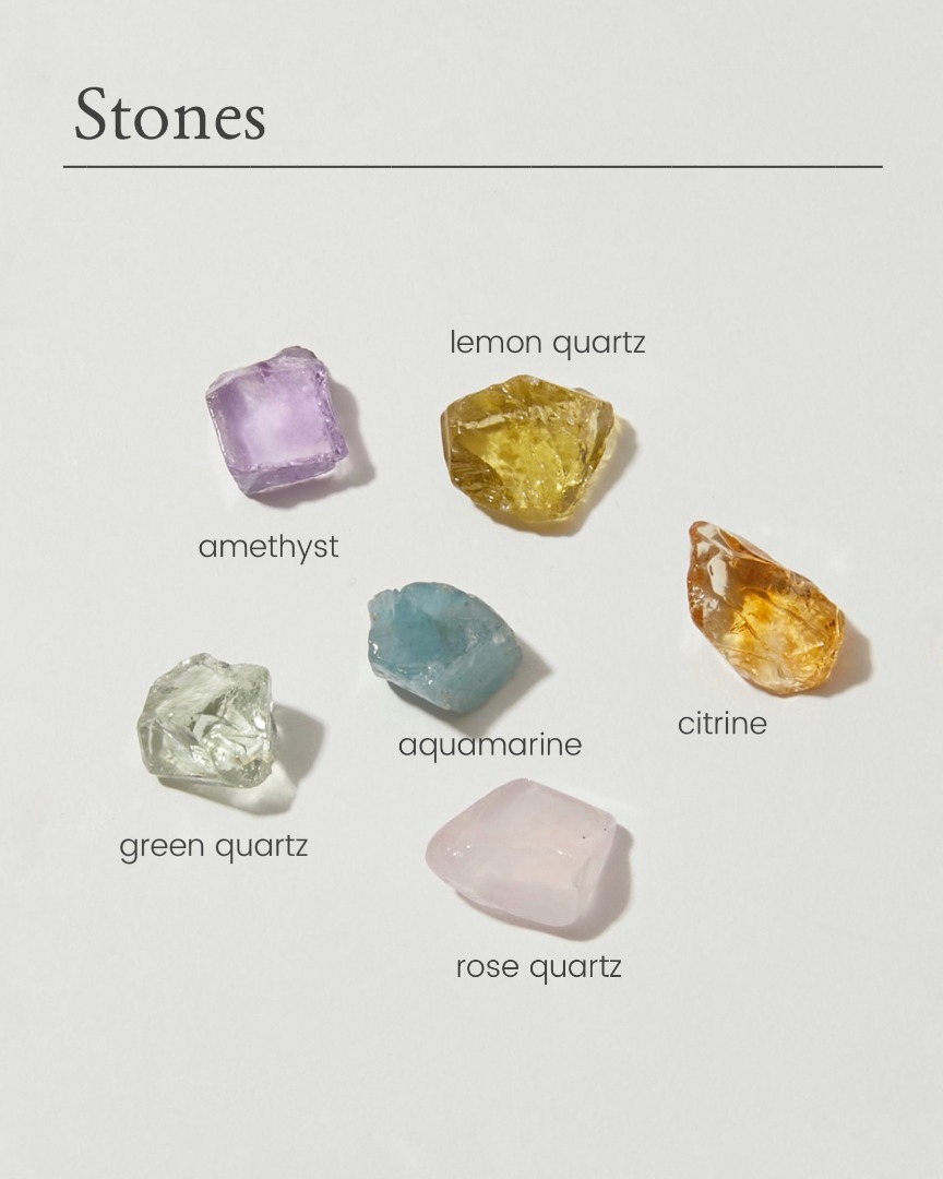 色とりどりに煌めく、お守りの原石は全6種の中から2種をご用意しました。それぞれの石の意味とともにお届けします。デスクに飾ったり、バッグの中に忍ばせたりしてお守りとしてそばに置くことであなたの力になったり、守ってくれるよう願って。