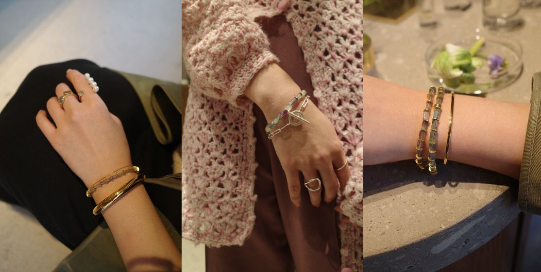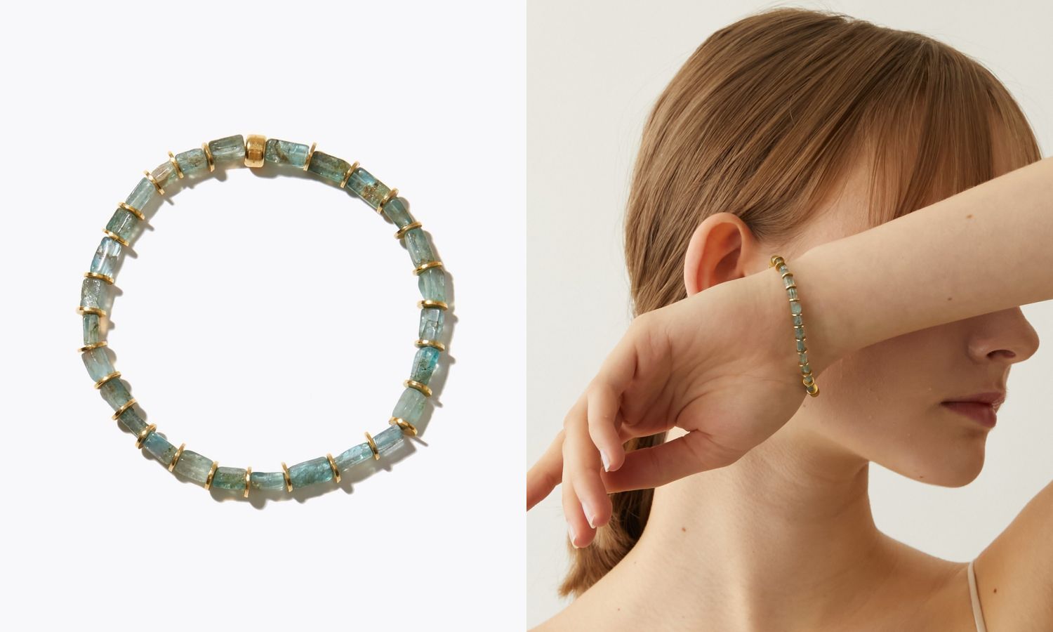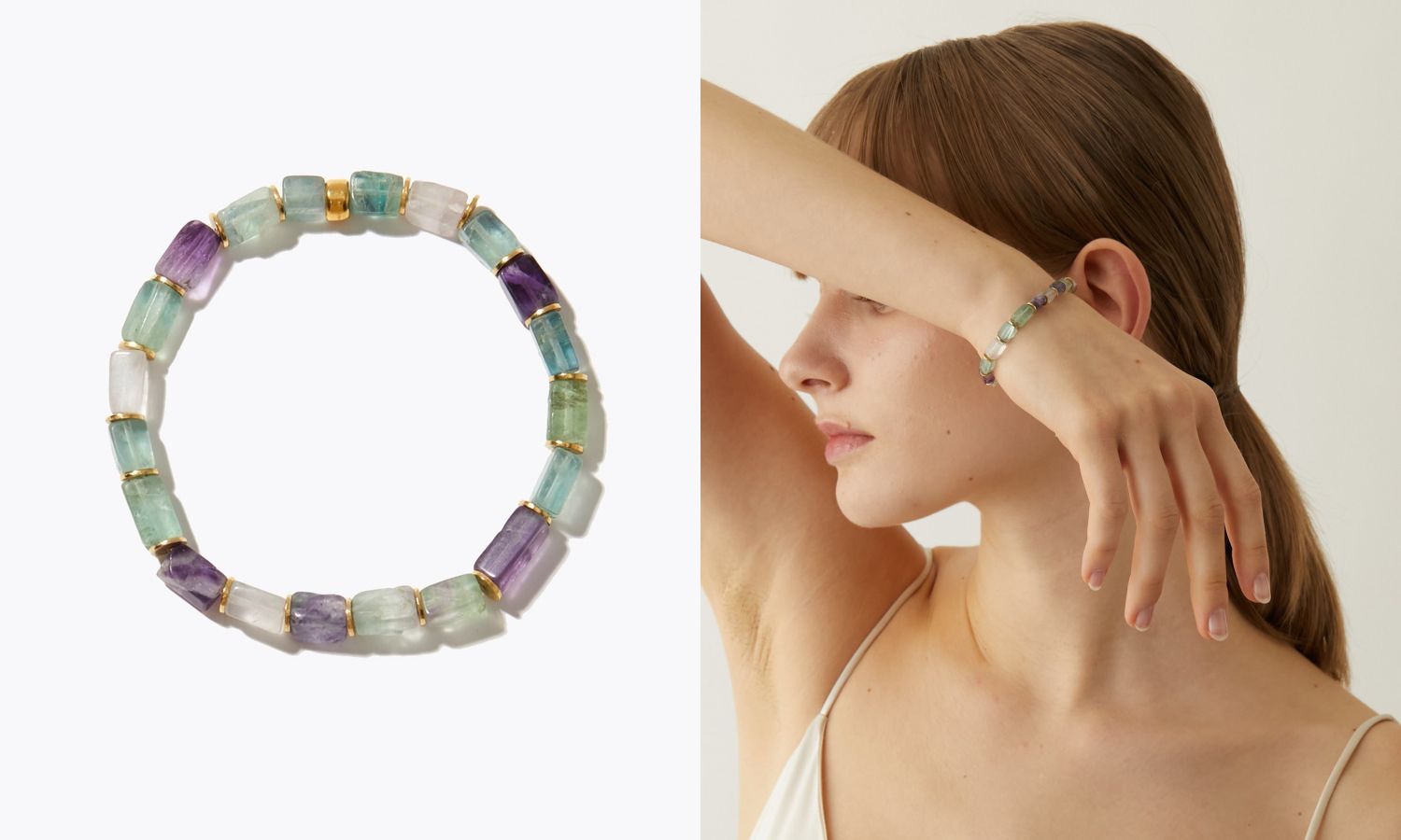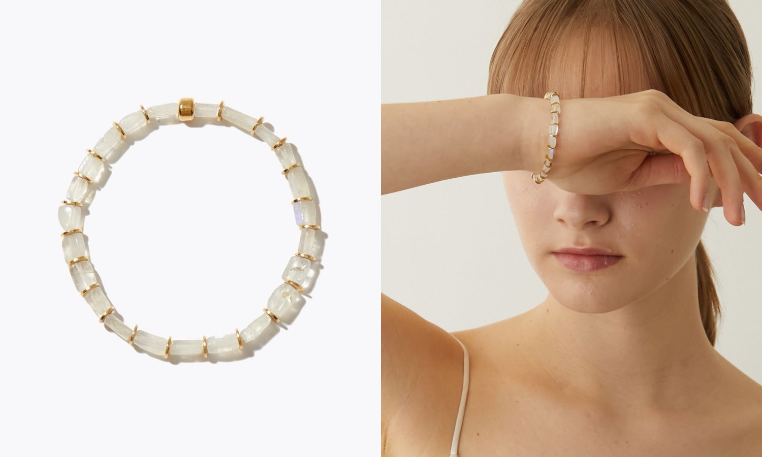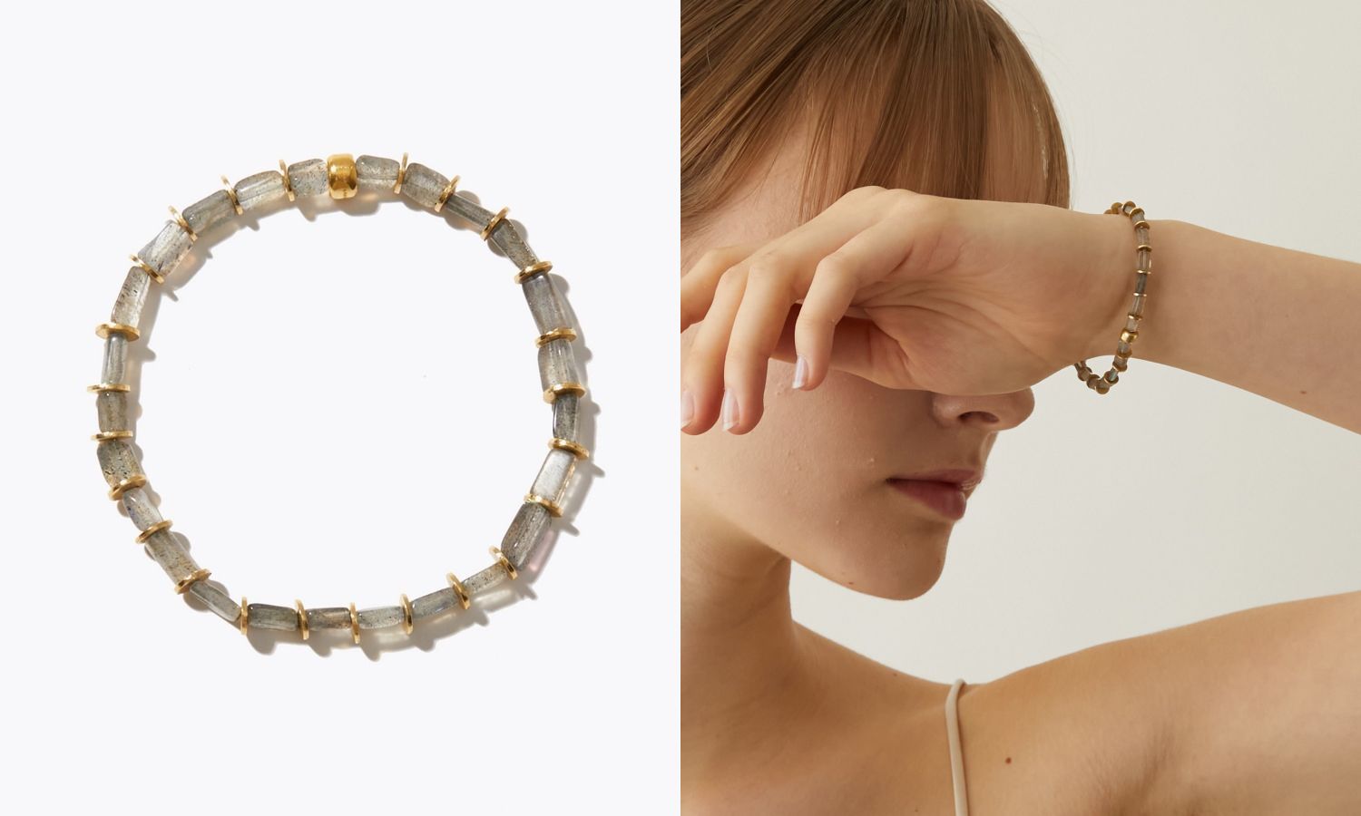 そして、春らしく艶やかで透明感溢れる色合いのストーンは、いくつもレイヤードしていただくのもおすすめです。すっきりとしたキューブビーズのブレスレットは、バングルや他のブレスレットとも相性が良いので、様々な手元のコーディネートをお楽しみいただけましたら幸いです。
