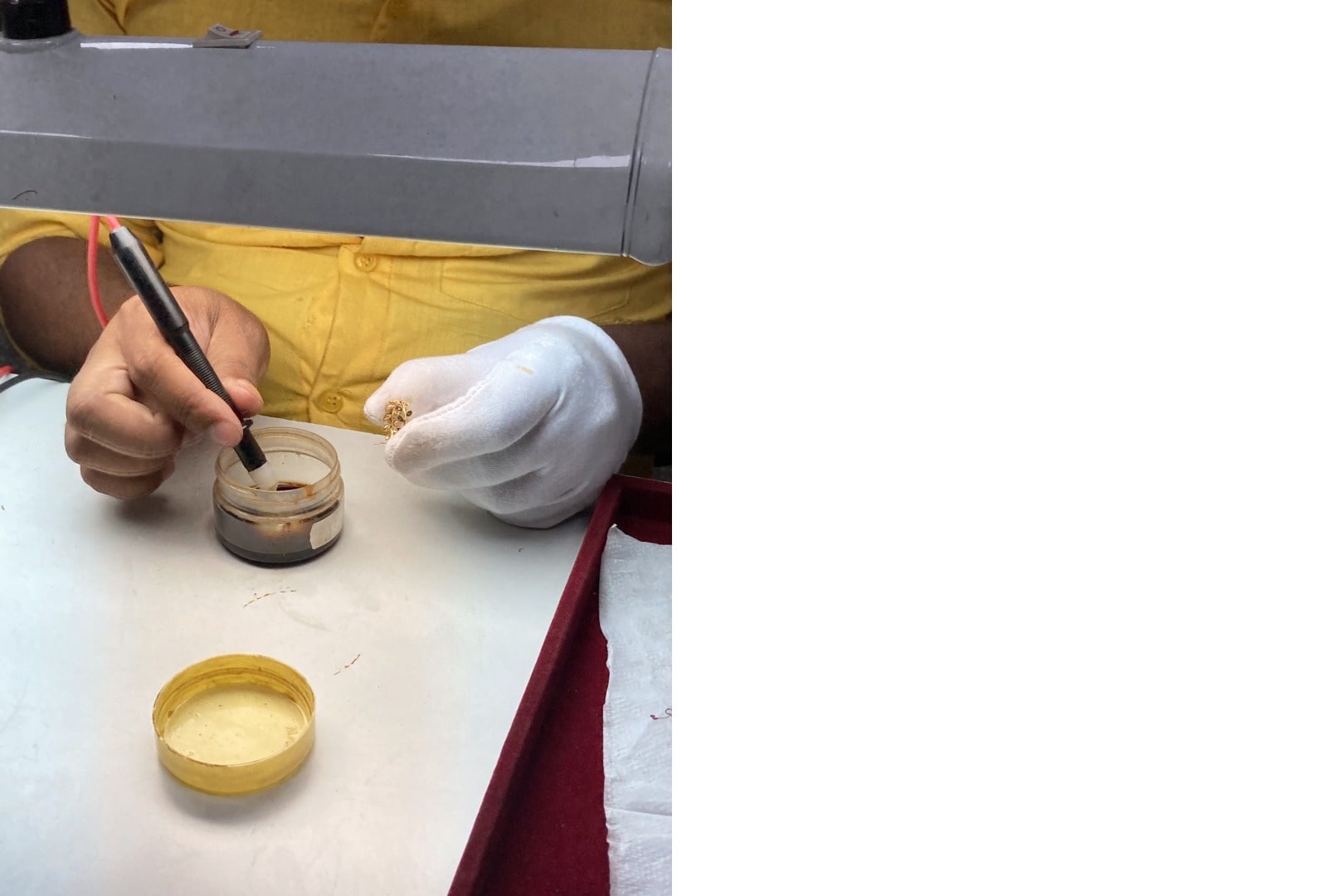 セッティングした細かいメレダイヤモンドの爪留めの部分に、細い筆のような機械を使い、丁寧にブラックロジウムのメッキを施していく作業は熟練の職人だからこそできる仕上げの工程です。