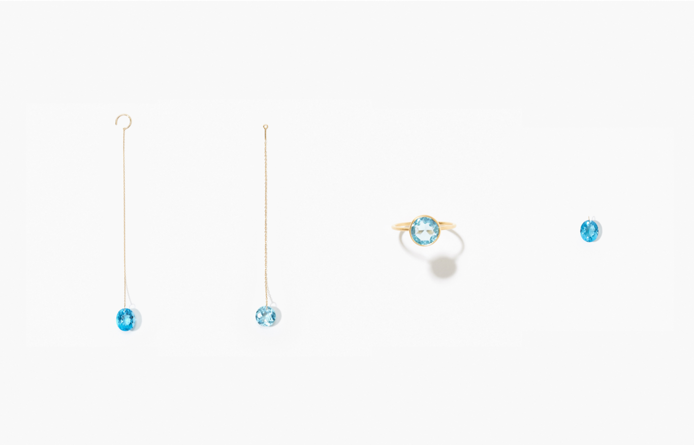 吸い込まれるような紺碧のブルー。鮮やかな青みが眩しい希少な石「スイスブルートパーズ」を使った限定商品です。大振りのスイスブルートパーズをチェーンピアス、チェーンイヤーチャーム、リング、チャームの4型に仕上げました。