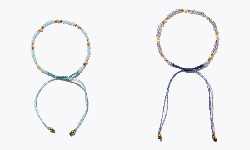 “I am” Donation aquamarine baby pearl bracelet 5,500yen (with tax) / “I am” Donation iolite baby pearl bracelet 5,500yen (with tax)
